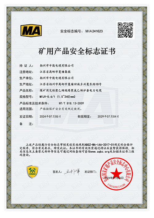 礦用產(chǎn)品安全標(biāo)志證書(shū)MYJV-0.6/1(1.5~240)mm2